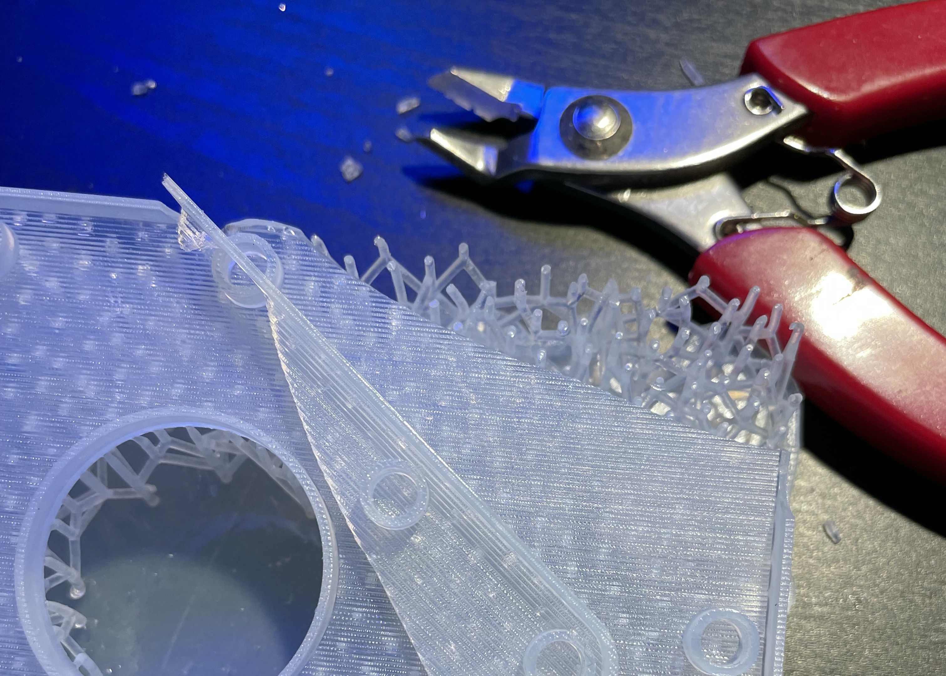 Lastly, the case to put everything in. I thought this would be easy to 3D print, since it’s just an enclosure with a hole in the front and in the back, but it turned out to be rather difficult to build. The 3D printer in my possession, a first generation Makerbot Replicator, wasn’t able to print parts that fit together nicely. The end result was three separate plastic pieces that didn’t fit together well and ended up being really flimsy.